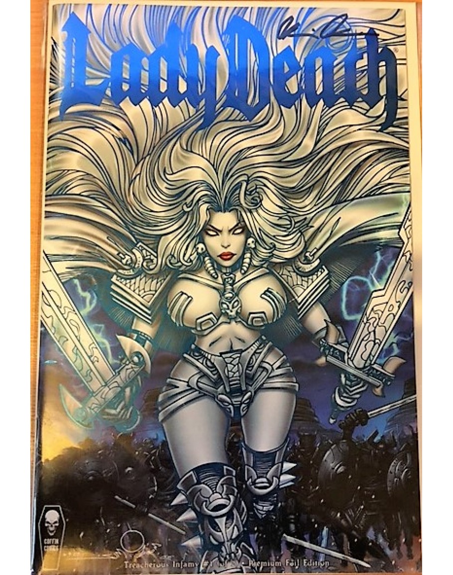 Coffin comics Lady Death Treacherous infamy #1 Premium Blue Foil Signed with Certificate by Brian Pulido.