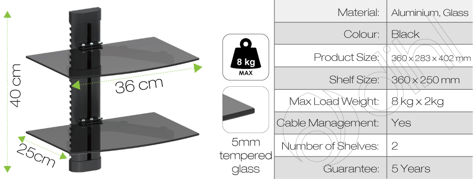 The Dihl Wall Mount is a stylish solution to helping you save space and offers support for your DVD/Blu-Ray Player, Satellite/Cable Box, Games Console, Speakers or any other unit you choose. The thick tempered glass is 5mm to ensure maximum strength which can hold up to 8kg per shelf.