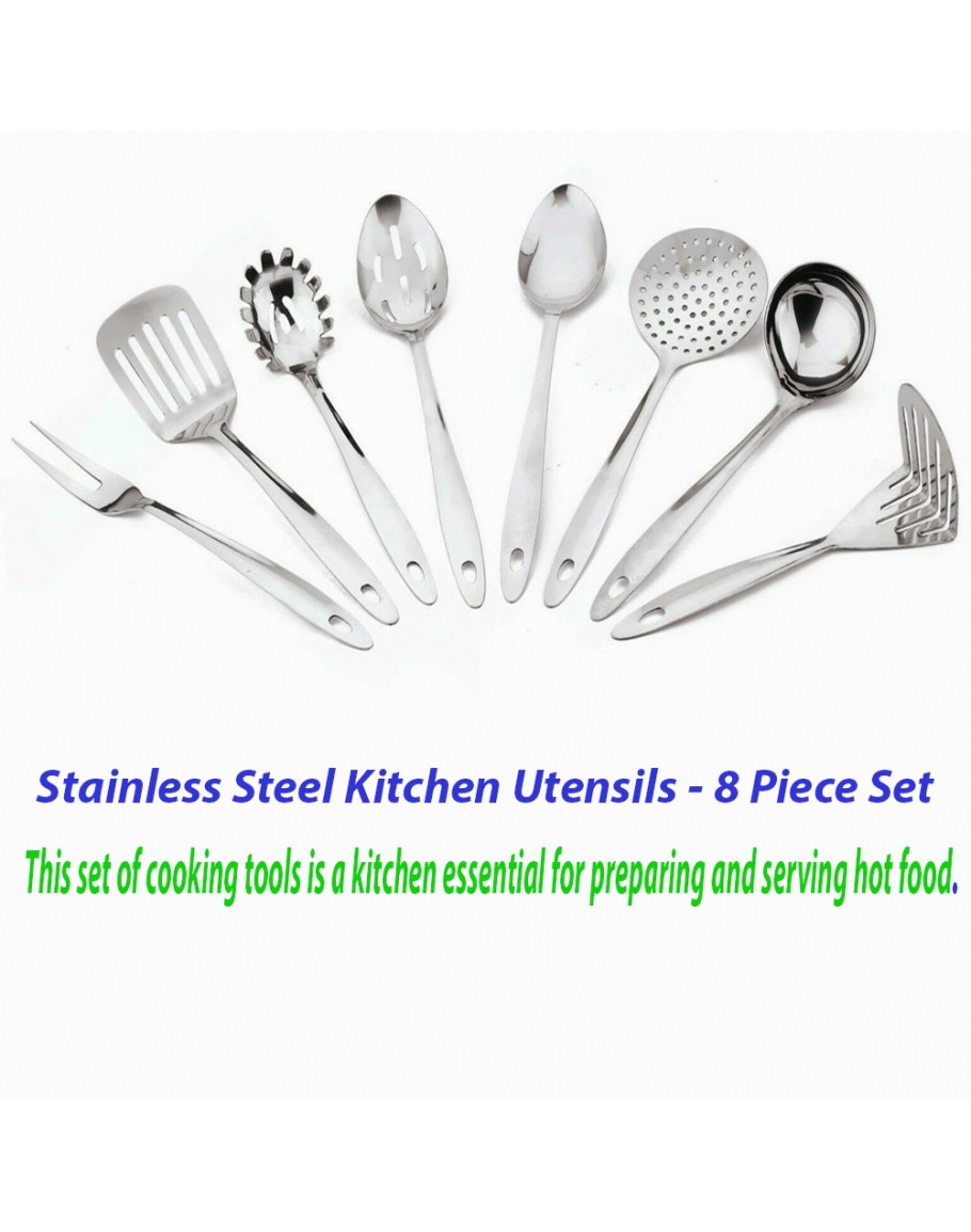 Set of 8 includes 1 of each tool ( unless you email us asking us to swap any cooking tool ) 1xSkimmer, 1xLadle, 1xServing Spoon, 1xSlotted Turner, 1xSpagetti Serving Spoon, Slotted Basting Spoon, Potato/ Vegetable Masher and 1xFork